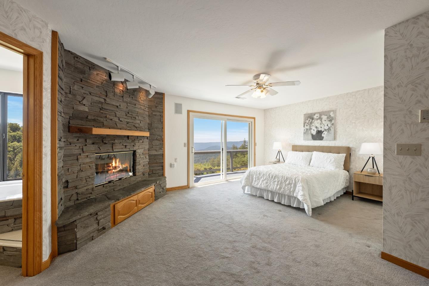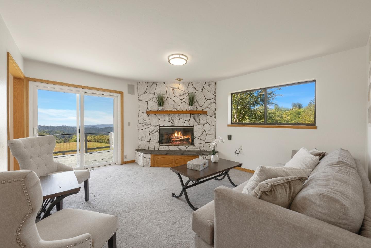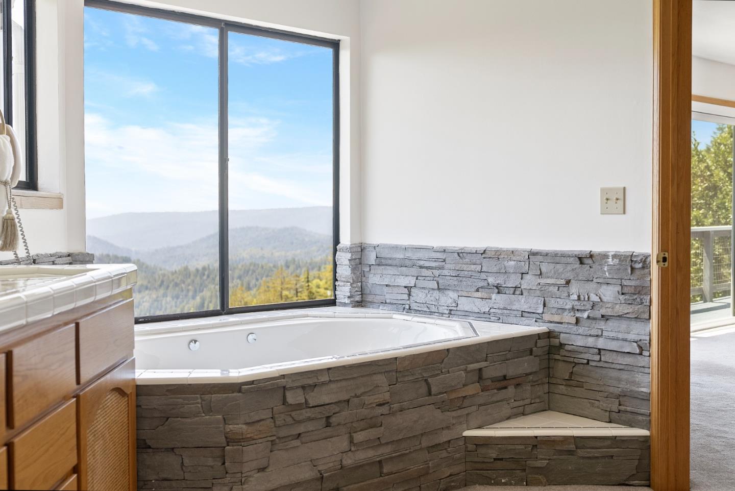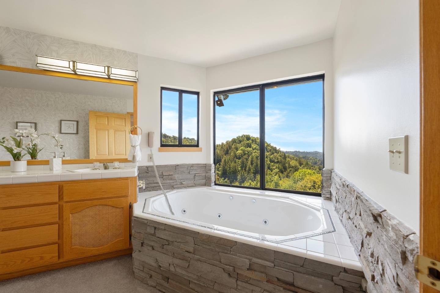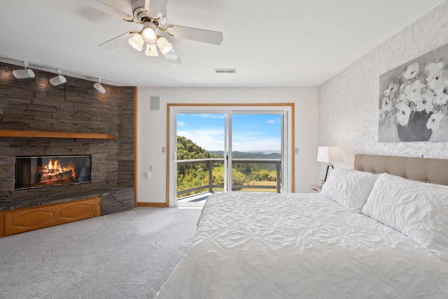 Spectacular views out to Monterey Bay! Usable land and great location up Bear Creek Rd. Serene views all the way to the bay that you will enjoy from the beautiful, flat, backyard knoll and throughout the home. Spacious 5-bdrm, 5-ba. home offers rare flexibility with 4 en-suite bdrms, incl. one on the main level great for guests or multigen. living. Expansive Primary Retreat features breathtaking views, spa-bath with jetted tub, cozy fireplace, and sitting area. Main level with separate dining, living, and family rms, all with unmatched vistas! Light, bright kitchen with ample storage, island, breakfast nook with views, and family/breakfast rm also with cozy fireplace. Formal dining room opens to the back deck and views, a perfect setting to dazzle guests. Adjoining living rm also with cozy fireplace and sliding glass doors to the deck. Upstairs large laundry rm, plus unfinished basement with walk-out access great for workshop, home gym, or custom expansion. New roof (2025) by Los Gatos Roofing, fresh exterior paint, newly re-paved driveway, usable land, 2-car gar. and space for oversized vehicle, majestic oaks. Top Los Gatos schools, and, close to downtown Los Gatos, Boulder Creek and Santa Cruz coast. Rare combination of privacy, views, and convenient access. Don't miss out!