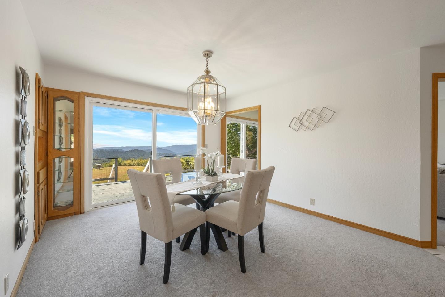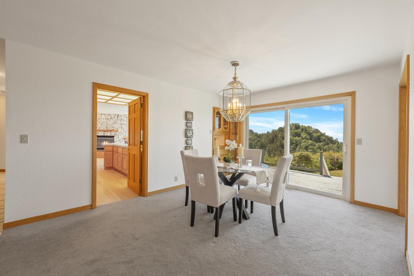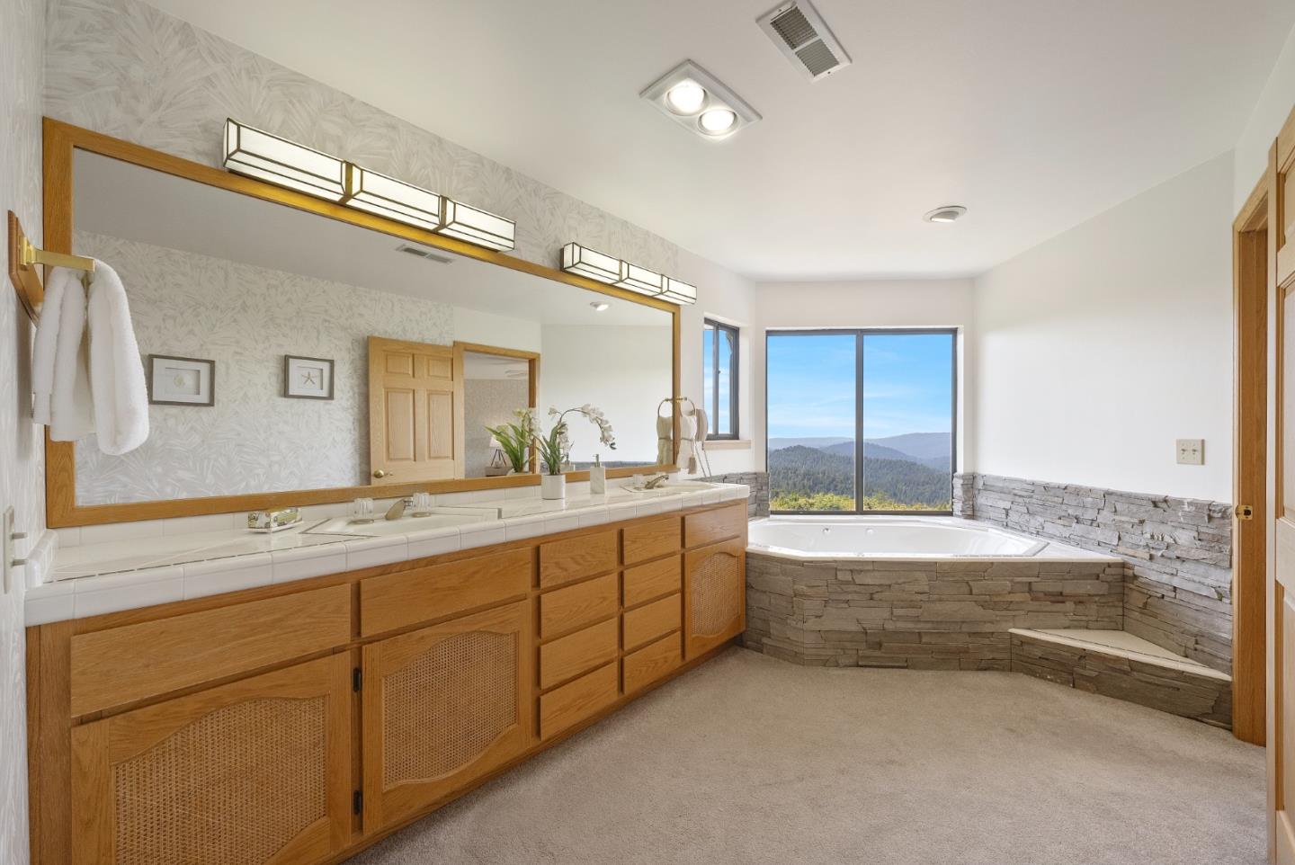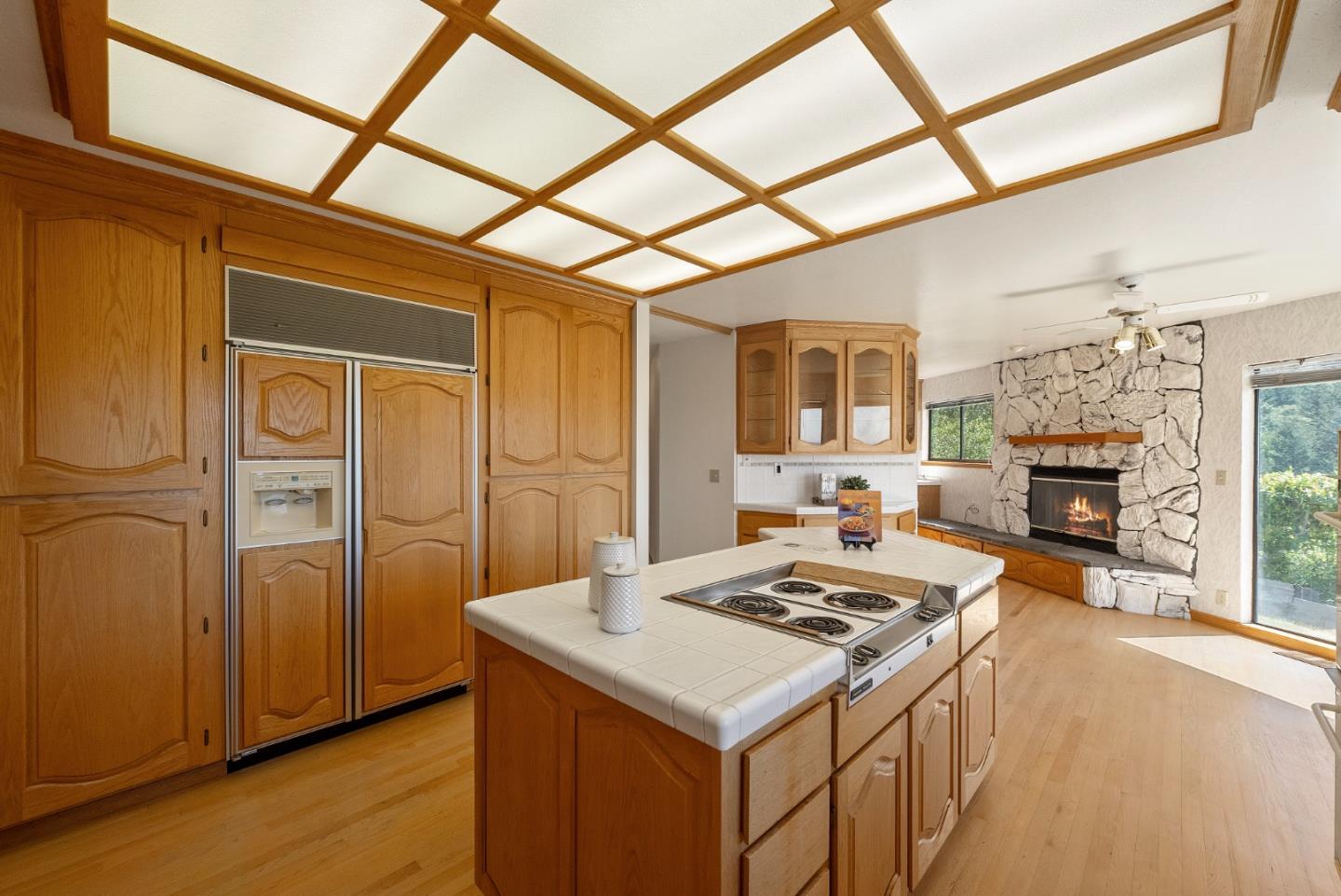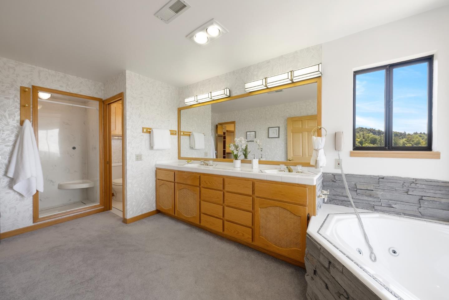 Spectacular views out to Monterey Bay! Usable land and great location up Bear Creek Rd. Serene views all the way to the bay that you will enjoy from the beautiful, flat, backyard knoll and throughout the home. Spacious 5-bdrm, 5-ba. home offers rare flexibility with 4 en-suite bdrms, incl. one on the main level great for guests or multigen. living. Expansive Primary Retreat features breathtaking views, spa-bath with jetted tub, cozy fireplace, and sitting area. Main level with separate dining, living, and family rms, all with unmatched vistas! Light, bright kitchen with ample storage, island, breakfast nook with views, and family/breakfast rm also with cozy fireplace. Formal dining room opens to the back deck and views, a perfect setting to dazzle guests. Adjoining living rm also with cozy fireplace and sliding glass doors to the deck. Upstairs large laundry rm, plus unfinished basement with walk-out access great for workshop, home gym, or custom expansion. New roof (2025) by Los Gatos Roofing, fresh exterior paint, newly re-paved driveway, usable land, 2-car gar. and space for oversized vehicle, majestic oaks. Top Los Gatos schools, and, close to downtown Los Gatos, Boulder Creek and Santa Cruz coast. Rare combination of privacy, views, and convenient access. Don't miss out!