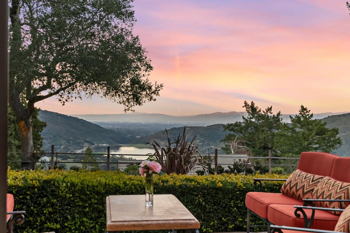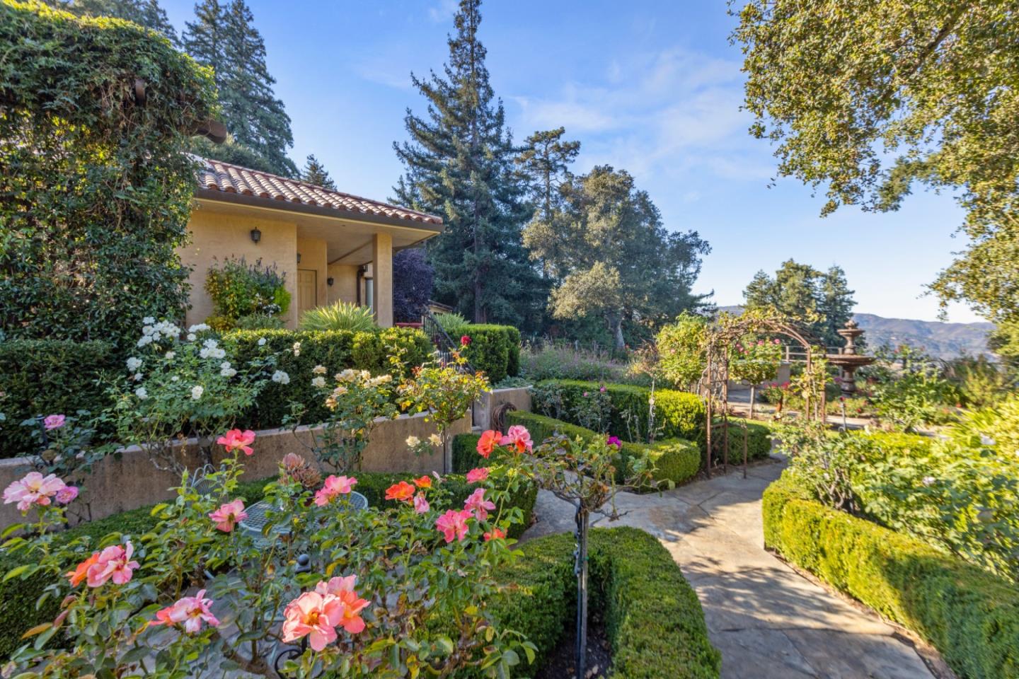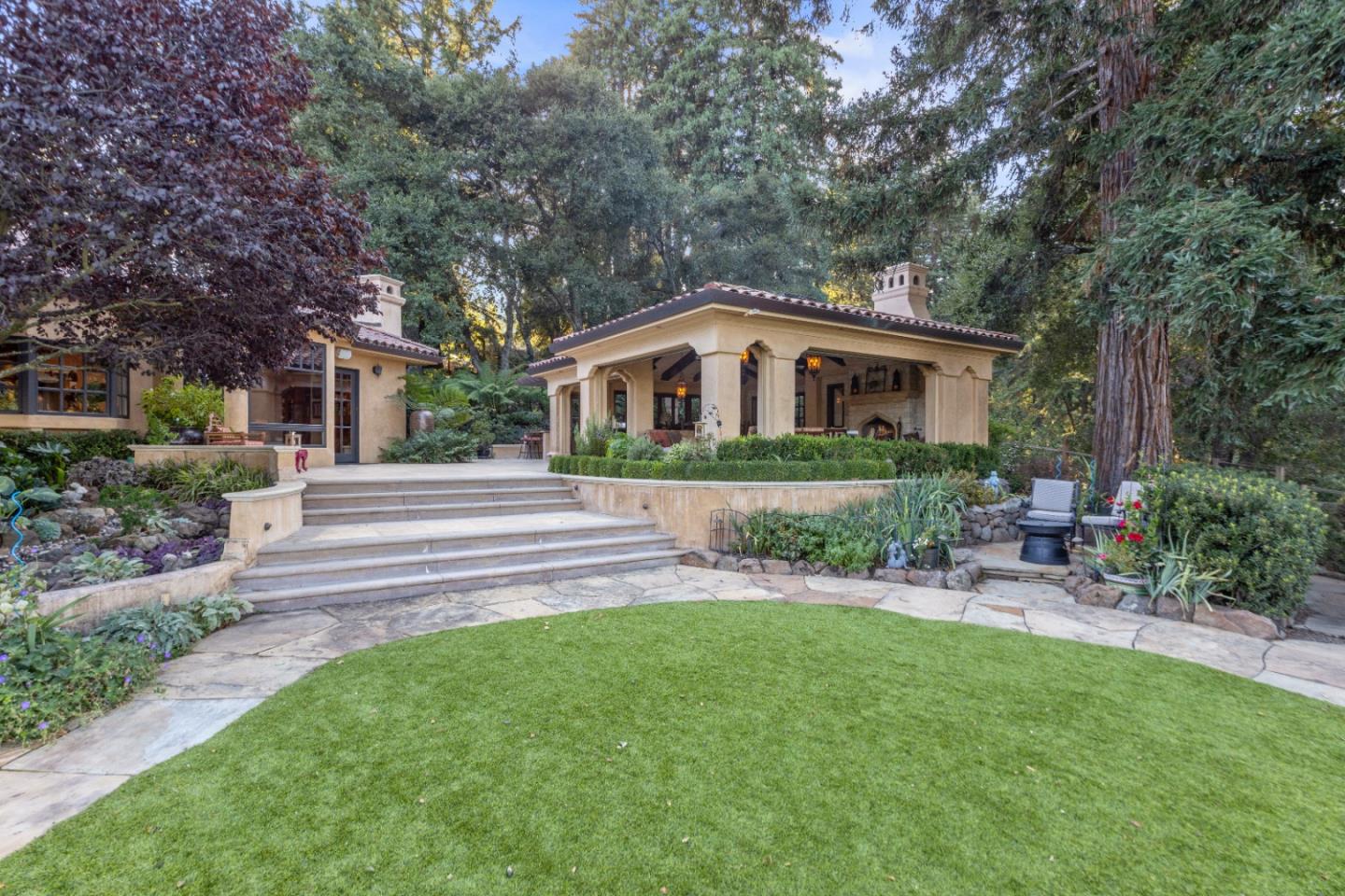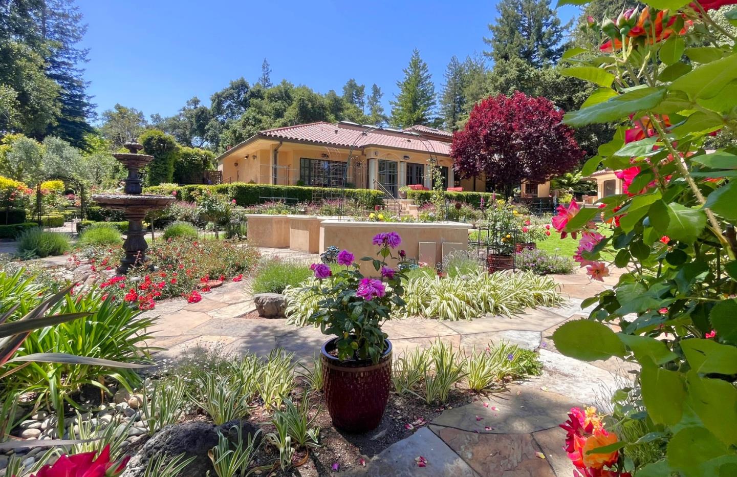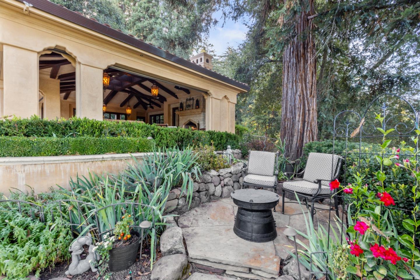PRESTIGIOUS NEIGHBORHOOD | FOUR MILES FROM DOWNTOWN LOS GATOS | LUXURIOUS 1197+-sf LANAI | LUSH GROUNDS AND STUNNING VIEWS | AN EXCEPTIONAL ENTERTAINMENT VENUE It's architect, Henry Herold, a head designer for Frank Lloyd Wright, designed it's 'prairie-design,' with strong lines and many windows it's perfect to enjoy the views beyond. Dual-gates open to reveal meticulously landscaped gardens that flourish across 2.15+- ac. Stone pathways take one to delight in any of several garden enjoyment nooks. See city lights and captivating natural vistas, as seen in the images. An indoor-outdoor sound system plays your favorite tunes and the jacuzzi is steps from the Primary Suite! A spacious kitchen, with high-end appliances and large pantry, is perfect for culinary enthusiasts. The family room with cozy fireplace opens to the kitchen, providing a warm atmosphere with views from every window. An elegant living room adjoins the dining area, with triple French doors creating a stylish indoor-outdoor setting. Natural light is abundant! It's dual water sources, city water for the home and well water for irrigation, plus electronic dual-gated access, marry elegance with practicality. Ample storage. Buyer to verify square footages: Main Home 3742sf, Lanai/ Outdoor Kitchen 1197sf, Gar. 614sf.